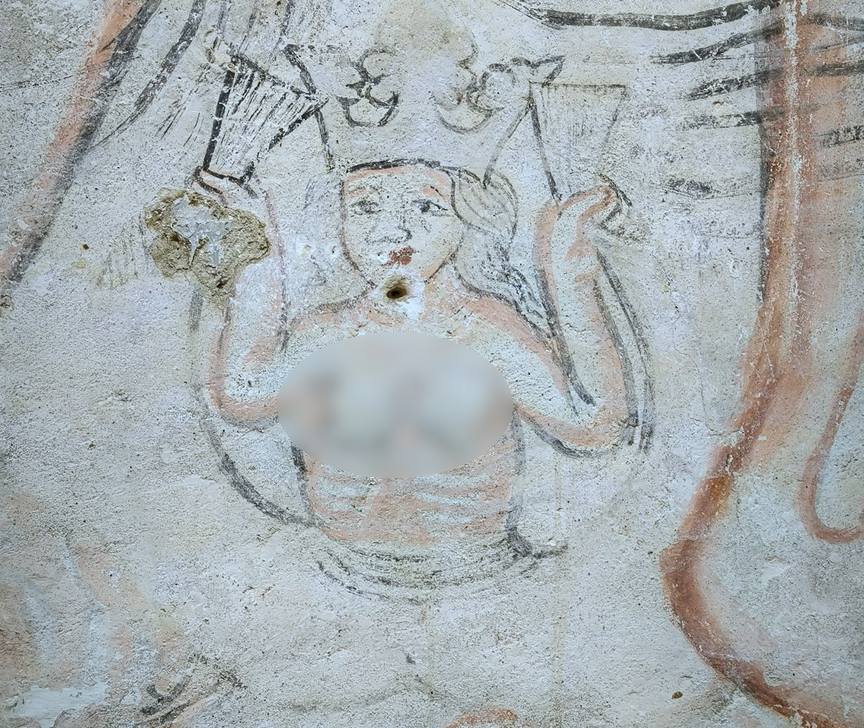 В Калининградской области обнаружили средневековую фреску женщины с обнажённой грудью. Снимок фрагмента росписи в конце мая 2025 года опубликовали активисты движения «Хранители руин».