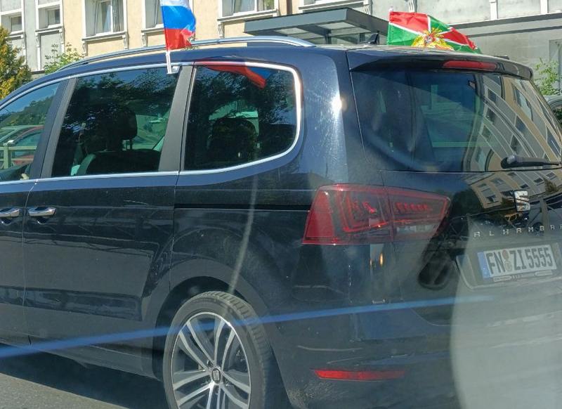 Очевидцы заметили на улице Горького (проезжая мимо корпуса БФУ им. И. Канта) автомобиль «Сеат Альгамбра», украшенный флагами России и флагом Пограничных войск России.