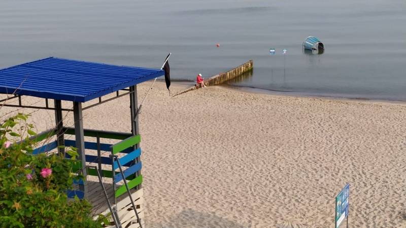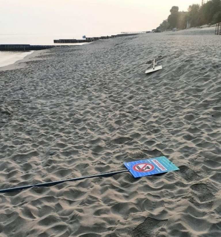 На Западном пляже (в районе улицы Гагарина) ночью в среду, 4 июня 2025 года, кто-то выкинул в море кабину для переодевания, повалил предупреждающие таблички.