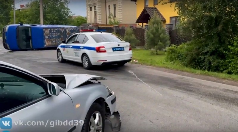 На улице Ломоносова, 90 в Калининграде днём в пятницу, 6 июня 2025 года, перевернулся микроавтобус.