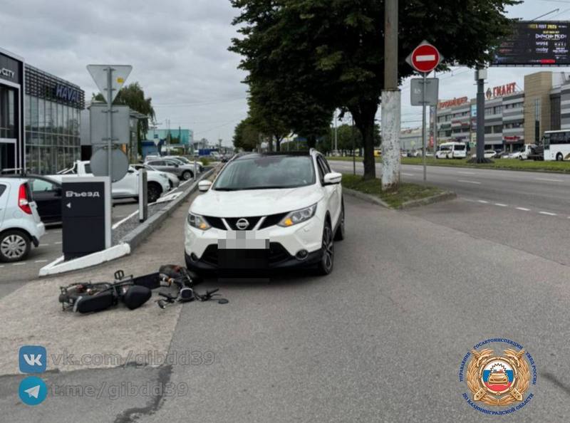 Водитель внедорожника «Ниссан» на Московском проспекте, 258, на выезд из Калининграда в среду, 18 июня 2025 года, в 08:50, проигнорировал ехавший в том же направлении, но не поворачивавший направо, в сторону дилерского центра «Ниссан Кашкай» и «Хэвэл», велосипед с электроприводом и врезался в него.