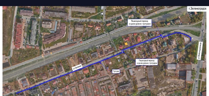 В Зеленоградске Калининградской области c помпой анонсировали появление тротуара в некурортной части города. Речь об улице Зелёной, между железной дорогой, рекой Тростянка и выездом в сторону Коврово.