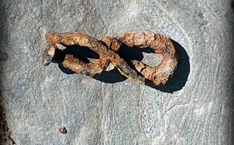 Специалист находился с группой туристов на старинном брусчатом спуске и обратил внимание на металлический предмет. Поднял его… и не смог сходу определить, что это. Чистка ржавой вещи не позволила прояснить её назначение. Нечто, напоминающее скрученный восьмёркой гвоздь, длиной 95 мм, шириной в 25 мм и диаметром отверстий в 5 мм.