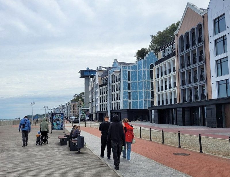 Город в городе растянулся вдоль нового променада, ставшего пешеходной улицей. Новая первая линия курорта простирается на 1 км 200 м. Широкая палуба с велодорожкой соединяет лестничный спуск с улицы Динамо со съездом ул. Балтийской. Её официальное название – Морской бульвар, почти как в Балтийске. Он застроен ещё не по всей длине. Наиболее оживлённая часть набережной пока расположена между перекрытыми забором старыми солнечными часами и новым лифтом.