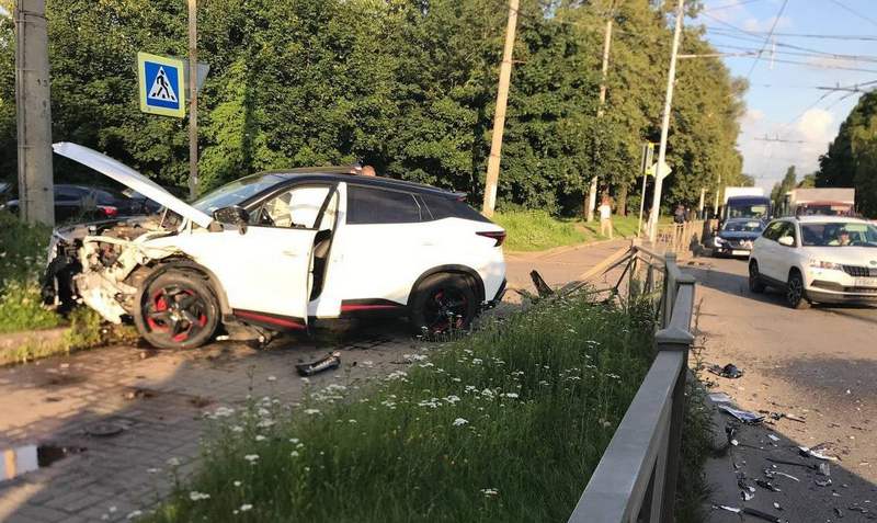 В 18:51 таксист на «Ладе Веста» ехал по проспекту Калинина и на полном ходу врезался в двигавшийся по ул. Дзержинского (то есть по главной дороге) автомобиль «Омода». От удара тот пробил ограждение и вылетел на тротуар у автоцентра.