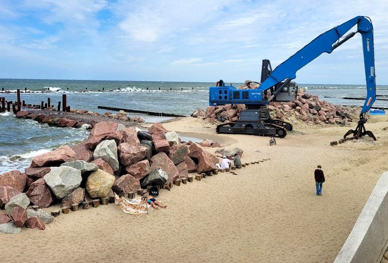 Расширение береговой зоны в районе выезда на променад с ул. Балтийской обеспечено новой системой волноломов и бун. Гидротехнические конструкции создали ветровую тень, а заодно удерживают песок во время штормов. Поэтому расширяющийся пляж превращается в полуостров.