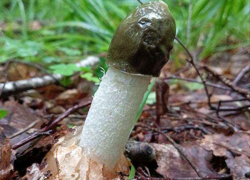 С июля по октябрь он ведёт активную, если можно так сказать про грибы, жизнь, привлекая к себе максимальное внимание. На вершине ножки находится шляпка с прозрачной слизью. А венцом является диск с отверстием. (Не проводите аналогий, пожалуйста!)