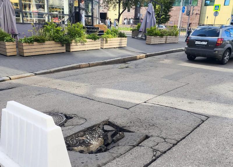 Яма у перекрёстка с улицей Театральной разрослась до угрожающих масштабов. Ещё 24 июля она пожирала лишь одну полосу, вынуждая водителей петлять перед светофором. К утру пятницы, 25 июля, трещины расползлись вширь и подобрались ко второй полосе. Движение рискует встать полностью.