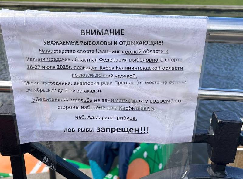 В вывешенном накануне состязаний на перилах объявлении в адрес «рыболовов и отдыхающих» значилось, что «лов рыбы запрещён». Им указали в виде «убедительной просьбы», чтобы они «не занимали места у водоёма со стороны набережной Генерала Карбышева и набережной Адмирала Трибуца».