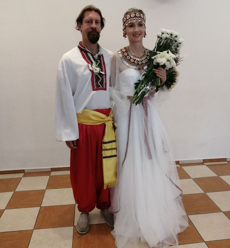 В необычных нарядах приехали в ЗАГС Балтийска Ольга и Юрий. Невеста родом из Чувашии, что было подчеркнуто национальным головным убором (масмак) и платьем с традиционный вышивкой. Жених – из Донецка, на церемонии он был в вышиванке и шароварах.