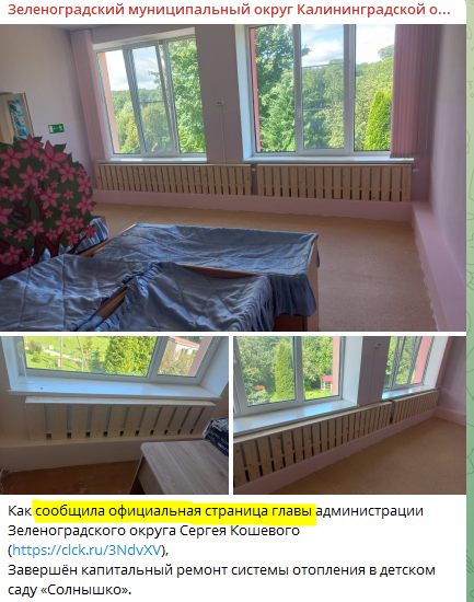 В среду, 13 августа 2025 года, в телеграм-канале властей появилась следующая информация: «Как сообщила официальная страница главы администрации Зеленоградского округа Сергея Кошевого, завершён капитальный ремонт системы отопления в детском саду «Солнышко».