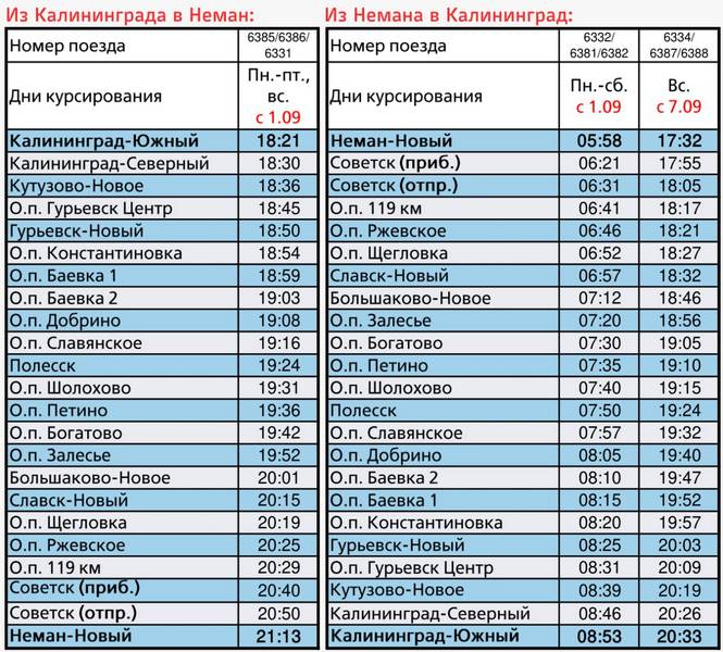 В обратном направлении из Немана поезд пойдёт в 05:58 с понедельника по субботу и в 17:32 в воскресенье, чтобы студенты смогли комфортно вернуться в Калининград к 20:33 (Южный вокзал).
