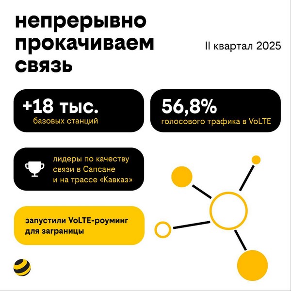 Компания продолжает масштабировать сеть: за год количество базовых станций увеличилось на 8,7% (плюс 18 тысяч), объём дата-трафика вырос на 11,2%, доля VoLTE в голосовом трафике — на 10,9 п.п. Запущен VoLTE-роуминг за рубежом, введены новые магистральные ВОЛС ёмкостью 1,6 Тбит/с, укреплена надёжность ЦОД в Ярославле и запущен георезервный сайт в Москве.