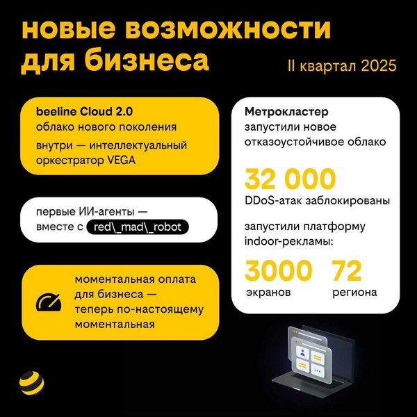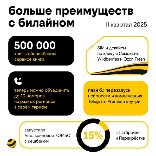 Среди продуктовых новинок — перезапуск платформы «план б.» с доступом к нейросетям, расширение семейной опции «Семья в Билайне» до 10 номеров, запуск услуги Branded Call, кешбэк в «Пятёрочке» и «Перекрёстке» в «Апельсиновом КОМБО», обновлённые «Книги Билайн» с ИИ-помощником и новые тарифы для бизнеса.