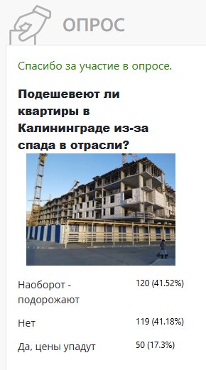 Согласно данным опроса* «Русского Запада», только 16% рассчитывают на снижение стоимости квадратных метров для покупателя из-за начинающегося кризиса в отрасли – снижения объёма ввода жилья.
