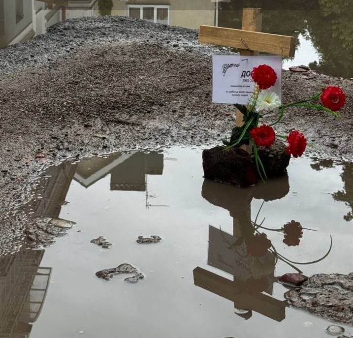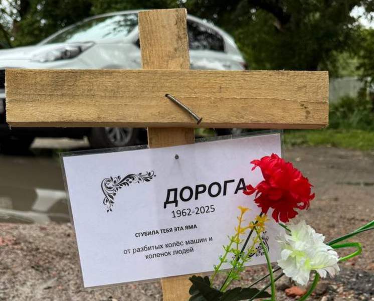 Над лужами возвышаются четыре сколоченных из простых досок креста, с основанием из кирпичей. У «могил» есть и таблички, гласящие: «Дорога, 1962-2025. Сгубила тебя эта яма. От разбитых колёс и коленок людей».