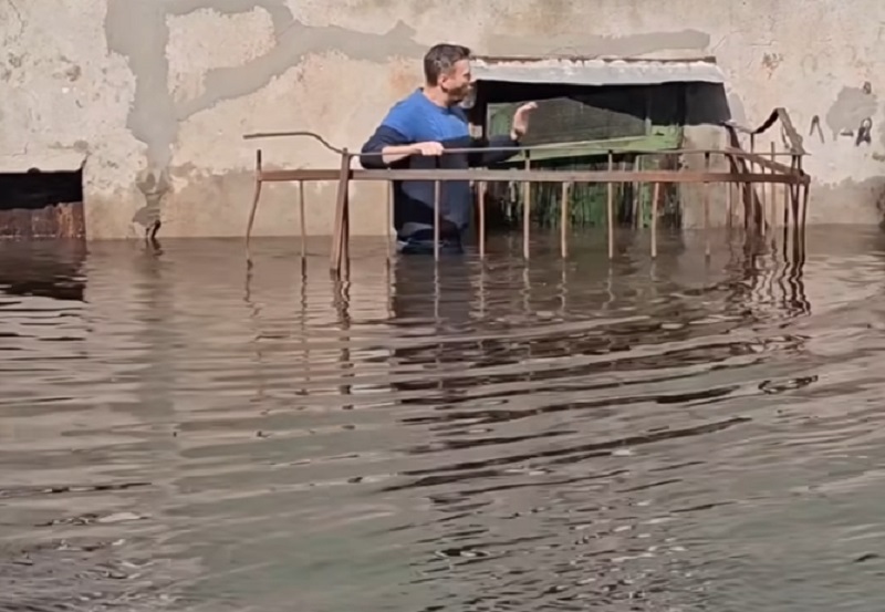 Специалист по экстремальным маршрутам и заброшенным локациям попросил зафиксировать его выходящим во двор, скрытый водой по колено. По колено взрослому человеку.