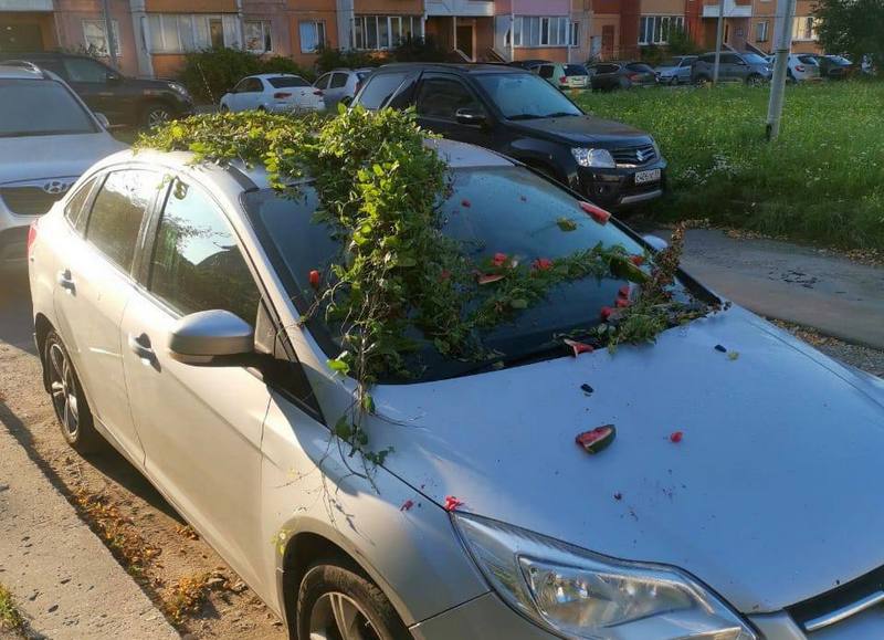 На «Форд Фокус» сбросили арбузные дольки (возможно, целый арбуз), а также вырванные с клумбы или газона цветы.