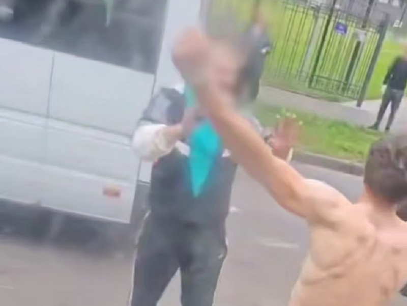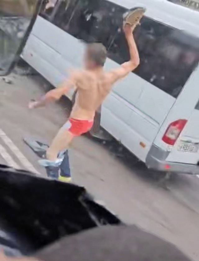 Движение застопорилось и вдруг, через водительскую дверь микроавтобуса вылез очень странный субъект. Вместо привычного для автомобилистов скандала, он сорвал с себя куртку, стянул футболку и джинсы. Остался в огненно-оранжевых трусах и обуви, но ненадолго. Обувь гражданин тут же сбросил и не просто так, а с размаху. Джинсам тоже досталось.