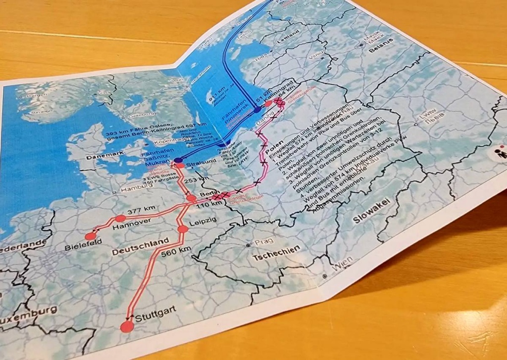 Путь непосредственно по Балтийскому морю – 393 километра. Портом прибытия в Калининградской области назван Пионерский. В Германии – порт Зассниц – Мукран, от которого ещё 253 километра до Берлина.