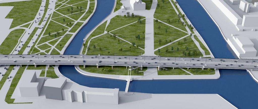Другое предложение – просто построить новый мост. Но на старом месте его уже возвести нельзя, поскольку за минувшие годы разные инстанции наворотили правовых актов. Теперь эстакада попадает в так называемую охранную зоны бывшей биржи, ныне музея изобразительных искусств, и должна эту зону «огибать». (Что мешало делать охранную зону с учётом наличия моста, непонятно, хотя в других местах это прекрасно получается.)