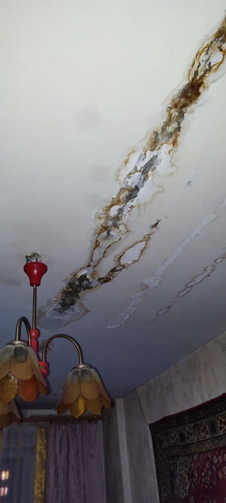 От первого заявления о протечке прошло несколько месяцев. За это время проевшие потолок осадки ожидаемо добрались до проводки и спровоцировали замыкание. Пришёл сентябрь, дожди участились.