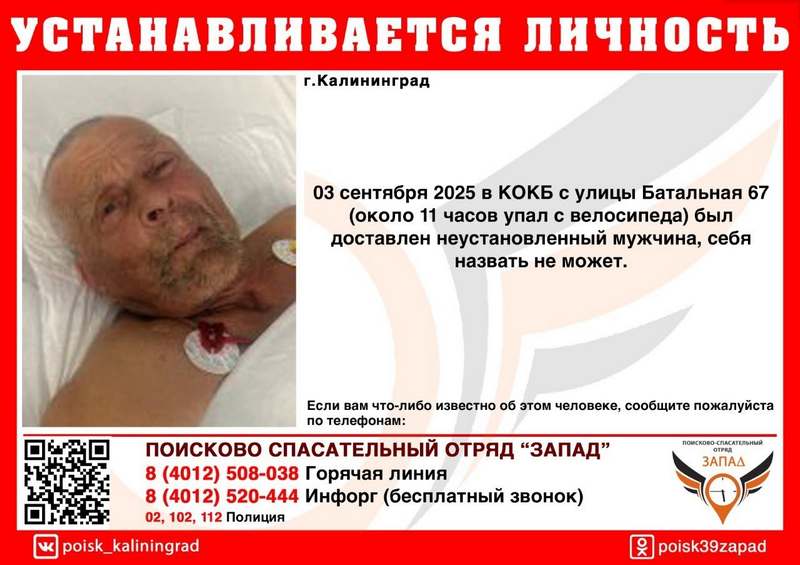 3 сентября 2025 года мужчина упал с велосипеда у дома ул. Батальная, 67 и был доставлен в клинику. Как пишут в соцсети, он лежит в палате интенсивной терапии с табличкой «неизвестный». Сам «говорить не может». Родственников то ли нет, то ли они его не ищут. Кто-то узнал в нём «дядю Толю с Батальной», но это не точно.
