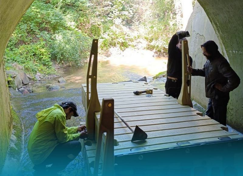 Светлые головы догадались вывести эти дорожки в арку под железной дорогой. Но так как, вообще-то, там вода, то этот момент решили обойти по верху – установить специальный понтон.