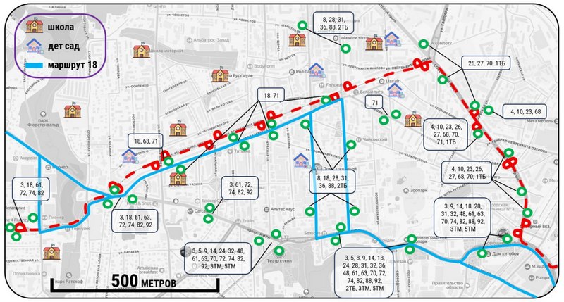 До окончания ремонта путей, 18-й будет ходить через улицу Карла Маркса. Туда он будет попадать с проспекта Мира по ул. Космонавта Леонова, а обратно – по ул. Комсомольской. Однако, трамваи №5 перестали ходить и по Советскому проспекту, от самой площади Победы. Власти города справедливо посчитали, что проспект и без того оснащён транспортом. Самым слабым участком остаётся отрезок между Советским и улицей Космонавта Леонова. Тем, кто привык добираться до или от проспекта по этой части Фестивальной аллее, придётся ходить пешком или объезжать по улице Кирова. Там ходит одна единственная маршрутка №71.