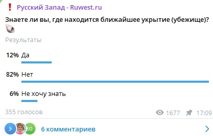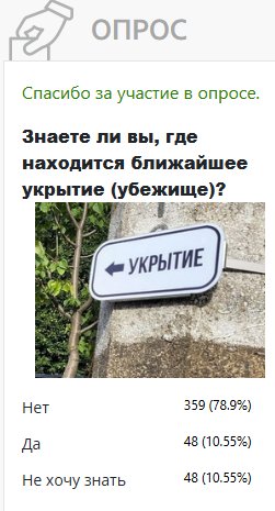 На вопрос о том, знаете ли вы где находится ближайшее укрытие (убежище), положительно ответили только 11%. Ещё 9% знать не хотят, поскольку не верят в наступление часа Ч.