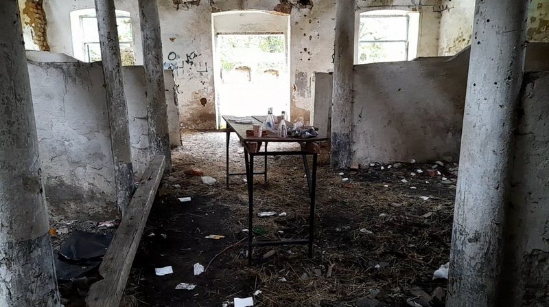 В помещении бывшей ветеринарии и конюшен устроили импровизированный мангал, хотя у здания деревянные перекрытия и основание кровли. Неизвестные любители пожарить мясо за чужой счёт затащили туда стол и массу алкоголя.