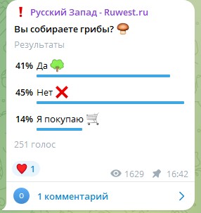 Согласно опросу «Русского Запада», любителей тихой охоты с ножичком прилично – 24% указали, что сами ходят в лес.