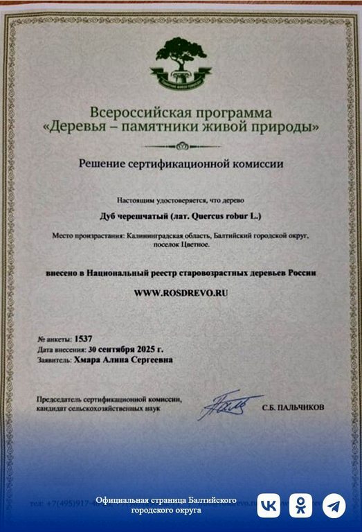 У ладушкинского дуба появился мощный конкурент: в Балтийском городском округе официально возник новый памятник природы – с официальным документом.