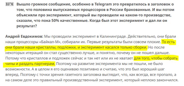 «Мы проводили эксперимент в Калининграде. Действительно, они брали наши процессоры «БайкалМ», собирали их. Первые результаты были совсем плохие. [...] Но после некоторых итераций он стал существенно лучше, и понятно, почему он не пошел дальше. Потому что кристаллов и подложек сейчас и так нет или их не хватает [...] Поэтому на развитие эксперимента мы не пошли, не было возможности. А в целом я его оцениваю позитивно и считаю, что это был хороший шаг вперед.