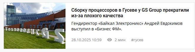 28 октября 2025 года ваше издание «Русский Запад» разместило на своем интернет-ресурсе https://ruwest.ru/news/153159/, а также в соцсетях ВКонтакте, «Одноклассники» и Telegram-канале издания публикацию с заголовком «Сборку процессоров в Гусеве у GS Group прекратили из-за плохого качества» и подзаголовком «Эксперимент по сборке микросхем на базе технологического кластера GS Group в Гусеве провалился и не будет продолжен». Автор заметки ссылается на интервью генерального директора АО «Байкал Электроникс» Андрея Евдокимова, размещенное на интернет-ресурсе https://www.bfm.ru/news/587543, в котором затрагиваются вопросы, связанные экспериментом по сборке процессоров «Байкал-М» на производственных мощностях GS Group Калининградской области.