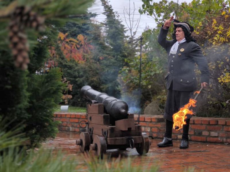 Выстрел произведён из реплики корабельного орудия, несущей службу во Фридрихсбургских воротах – так в филиале Музея Мирового океана отметили день создания российского Военно-Морского флота, день моряка-надводника и день судостроителя. Пылающий факел к фитилю пушки подносил человек, в костюме, стиллизованном под форму начала 18 века.
