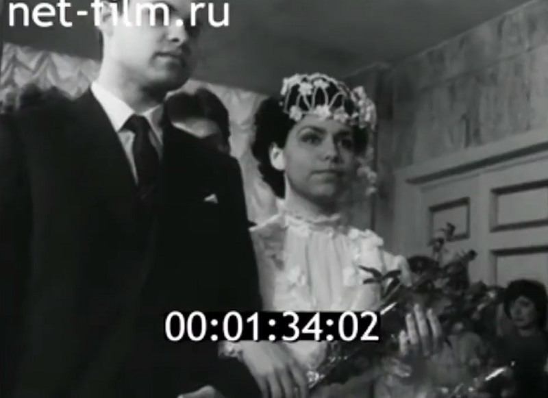 Показали и свадьбу: новая семья родилась почти одновременно с новым дворцом семейных ценностей. Жениха и невесту встречают хлебом-солью. Красавица с чёрной косой в русском сарафане кланяется в пояс и преподносит каравай молодому человеку в строгом костюме. Пара образцовая: военнослужащий Михаил Тюняев и секретарь комсомольской организации Музыкального училища Виктория Леонтьенко. Почти не улыбаются, ведь камера направлена на них в столь ответственный момент! Волнуются.
