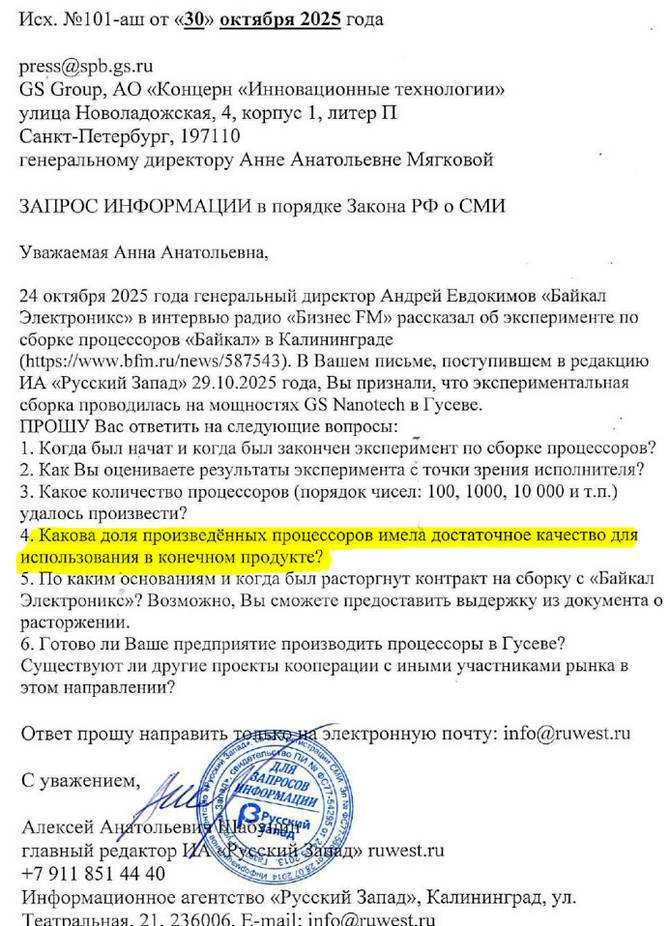 Любопытно, что на прямой запрос «Русского Запада» от 30 октября 2025 года («Какова доля произведённых процессоров имела достаточное качество для использования в конечном продукте?») ещё 6 ноября пресс-служба GS Group ответила отговоркой, сославшись на «конфиденциальность». Оказалось, что никакой конфиденциальности не было.