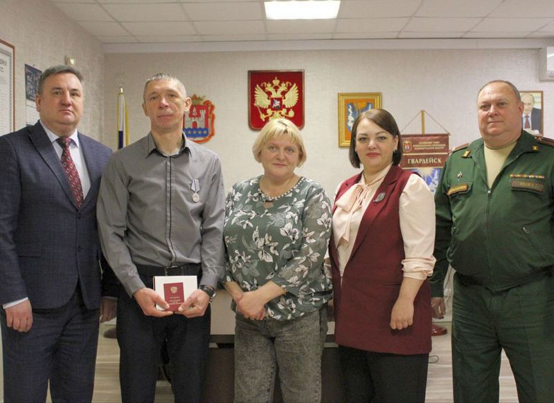 В понедельник, 10 ноября 2025 года, председатель Совета депутатов Гвардейского муниципального округа (ГМО) Игорь Шаплов и военный комиссар Гвардейского и Полесского районов Вячеслав Инин торжественно вручили медаль «За отвагу» участнику специальной военной операции.