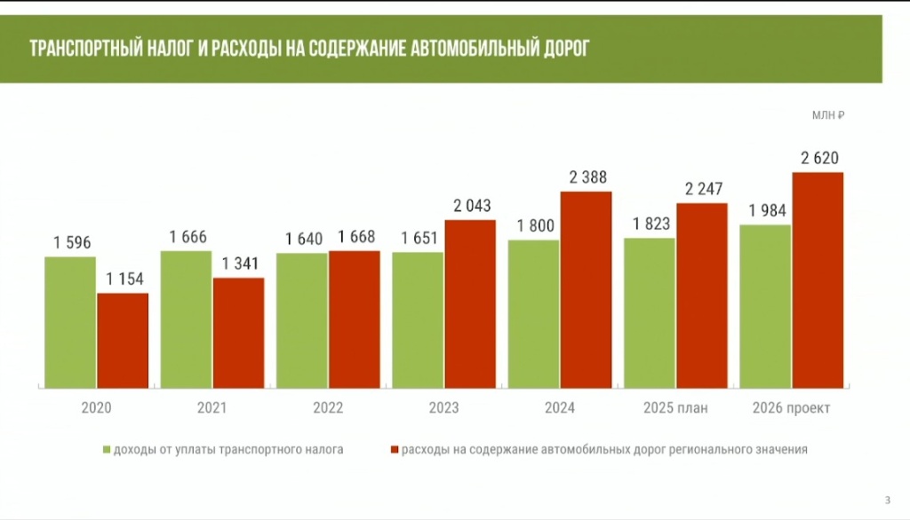 Порембский слайдами пояснил, что транспортного налога стали собирать хоть и больше, однако, расходы на содержание дорог «регионального значения» в 2024 году превысили эти сборы на 32%. Нынешнее повышение должно дать +211 млн рублей в казну. Правда, и в этом случае сборы не покроют планируемых затрат на содержание ни в 2025, ни в 2026 годах.