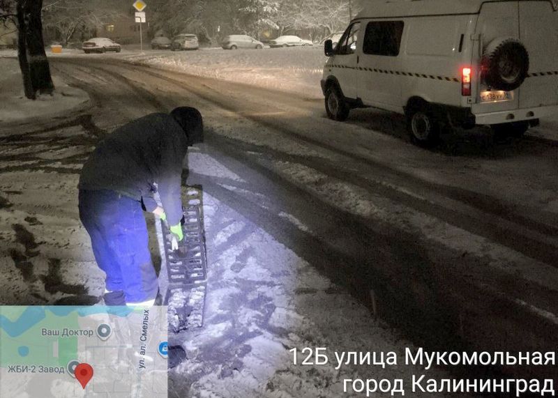 Муниципальное учреждение «Гидротехник» занимается, по данным властей Калининграда, расчисткой дождеприёмных колодцев от льда и снега.