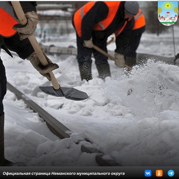 На изображения мужчин, работающих с лопатами в районе каких-то рельс, помещены логотип и другая атрибутика неманской власти. Фишка в том, что это изображение сделано как минимум в 2016 году, а, может, и раньше и фигурирует на сотнях российских сайтов. Причём фотография – постановочная.