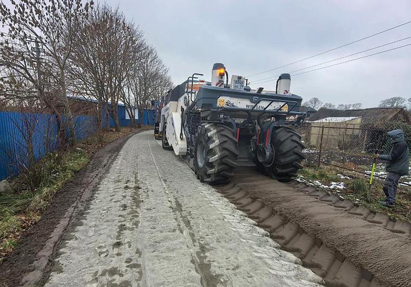 Как рассказала глава администрации Ольга Гракова, применяется инновационный метод «ресайклинга». Его суть в том, что прямо на основании из песчаной смеси рассыпается цемент (в данном случае, по 30 килограммов на квадратный метр), который потом специальная машина перемешивает. Весь микс застывает, образуя прочное основание, пригодное для укладки последующих слоёв или прямо как дорожное полотно, что будет и в этом случае.