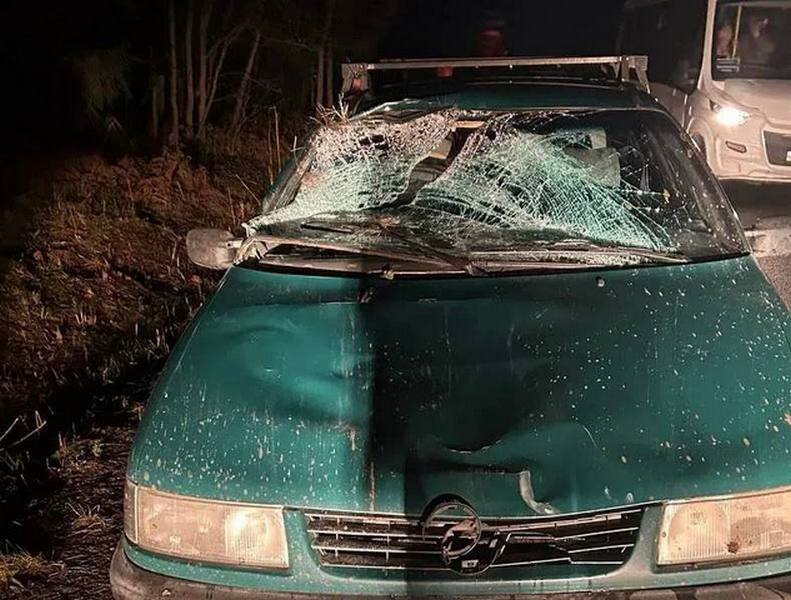 Зелёный легковой автомобиль, напоминающий «Фольксваген пассат», гнал по трассе с такой скоростью, что копытное не успело среагировать. Машина сбила крупное животное и сохатый завалился на лобовое стекло – оно пробито насквозь. Лось умер сразу.