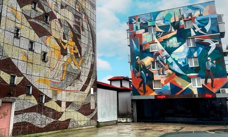 В 300 метрах от администрации Светлого Калининградской области четыре этажа пятиэтажного жилого дома расцветила монументальная роспись в духе СССР. Панно появилось на фасаде здания по улице Советской, 1, рядом с легендарным универмагом «Атлантик».