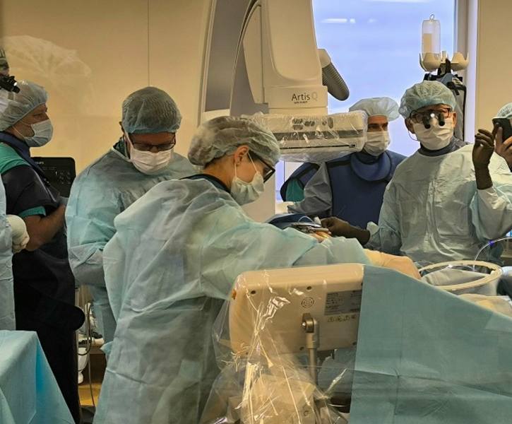 Состояние женщины не позволяло проводить протезирование на открытом сердце. Было принято решение о транскатетерной имплантации на работающем сердце, то есть клапан доставили по сосудам через небольшой разрез в паху.