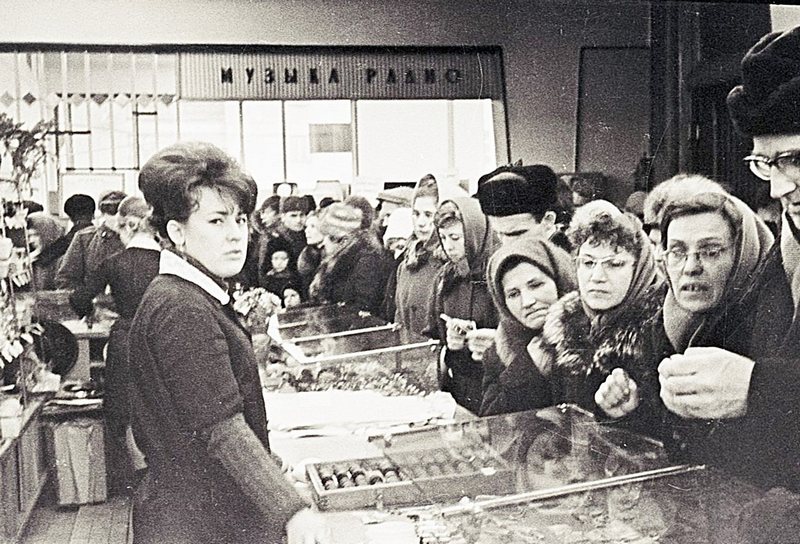 На других снимках запечатлён универмаг «Маяк», снаружи и внутри. Внутри невероятная толчея! Что дают? Судя по фото, искусственные ёлочки, украшения и другие праздничные товары. Обратите внимание, как однообразно одеты люди. Зато, есть что вспомнить. Эти снимки набирают сотни просмотров.