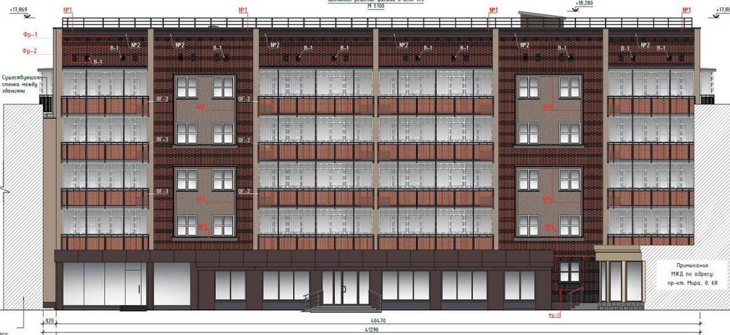 Фасад облицуют плиткой под красный кирпич, существующие пилястры получат ритмичное выделение за счёт «акцентных плоскостей». В общем, в двух словах: дом станет похож на немецкий, как «ганзейские дома» на Ленинском проспекте, которые любят фотографировать туристы как пример немецкой застройки.