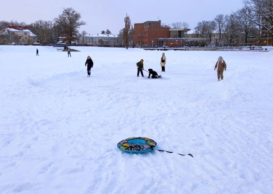 В воскресенье, 11 января 2026 года, на затвердевшую акваторию озера Поплавок высыпали гуляющие. Взрослые вынесли с собой лопату и коньки. Лопату дали детям, которые принялись счищать снег со льда в 30 метрах от берега.