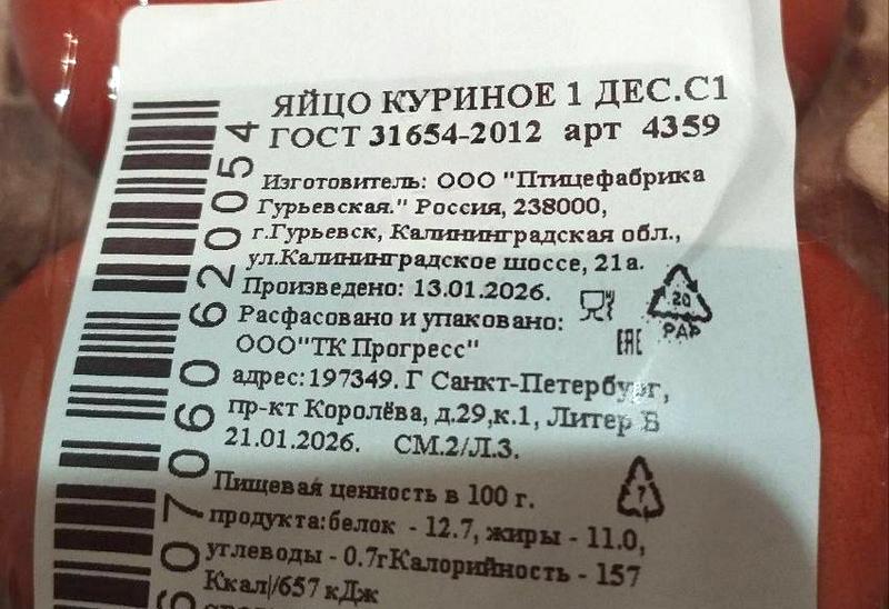 На этикетке производителем указано ООО «Птицефабрика Гурьевская». Дата выпуска яиц: 13 января 2026 года. Расфасовка и упаковка выполнена 21 января 2026 года в Санкт-Петербурге юрлицом питерской сети ООО «ТК Прогресс». Но не навалом же яйца ехали в Северную столицу? Получается, что себестоимость яиц наполовину меньше их цены в Калининградской области. Со своих родных земляков можно сдирать три шкуры. Ведь им не остаётся ничего другого, кроме как платить.